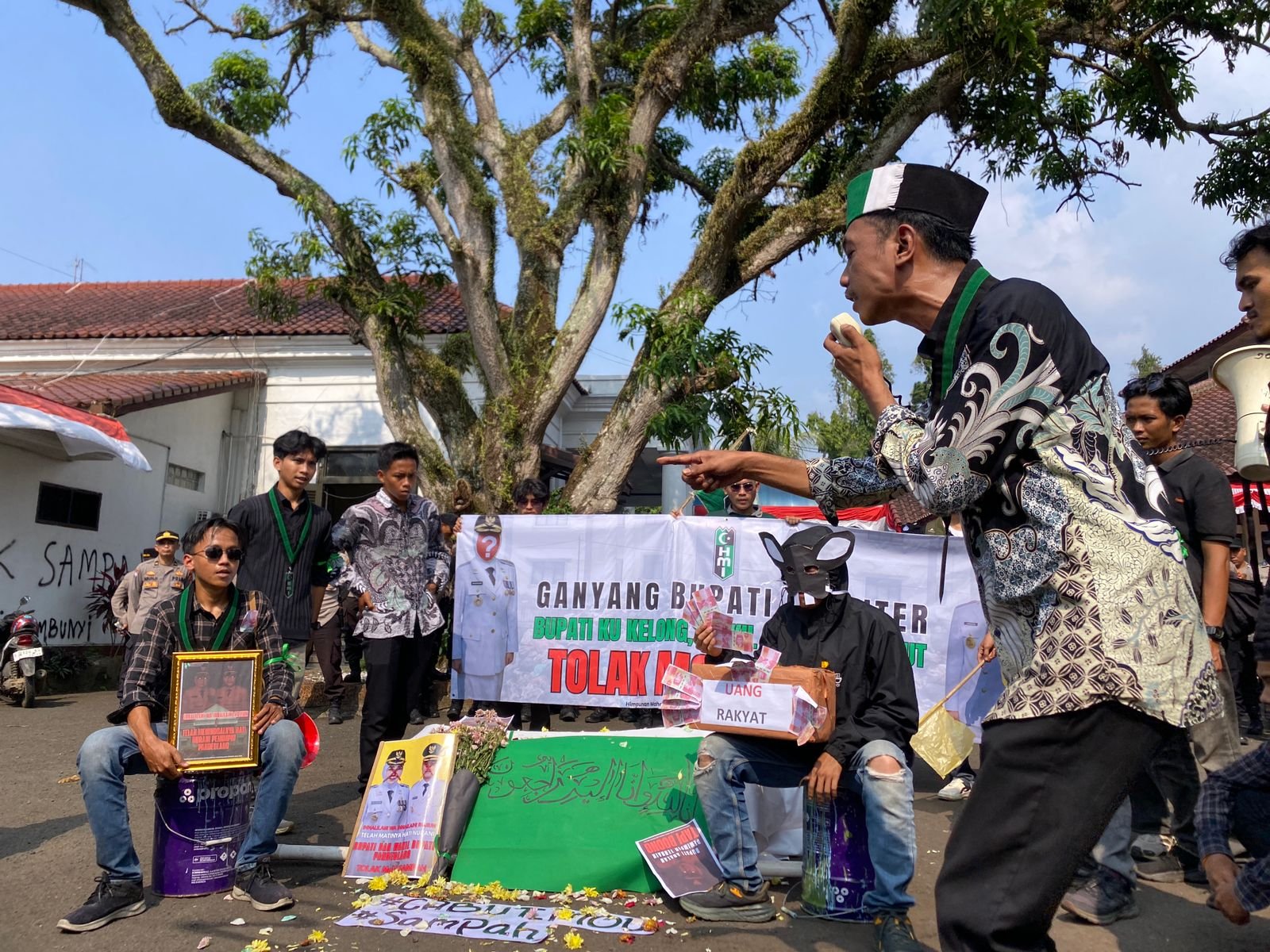 Dalam aksinya, aktivis mahasiswa yang tergabung di HMI membentangkan poster kecaman, dan spanduk bertuliskan “Ganyang Bupati Otoriter, Bupati Ku Kelong (diculik makhluk gaib,red), Wakil Bupati Nyumput (sembunyi,red), Tolak MoU Sampah”, dan foto wajah Bupati-Wakil Bupati (Wabup) diganti tanda tanya.
